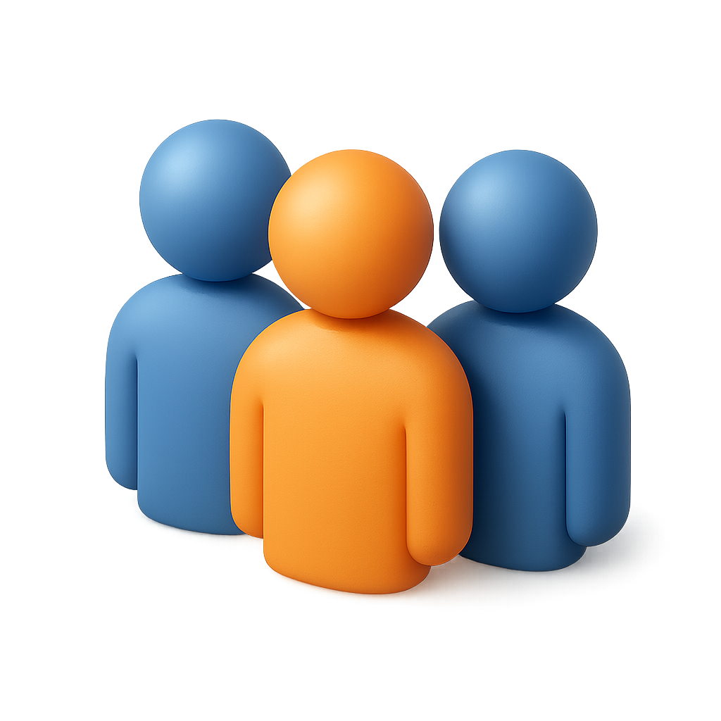 /Collection: /by davooda/Type: PNG/A vibrant 3D icon featuring three stylized figures, with one in orange and two in blue, arranged closely. The figures have a volumetric design and are presented in a three-quarter view against a soft gradient background.