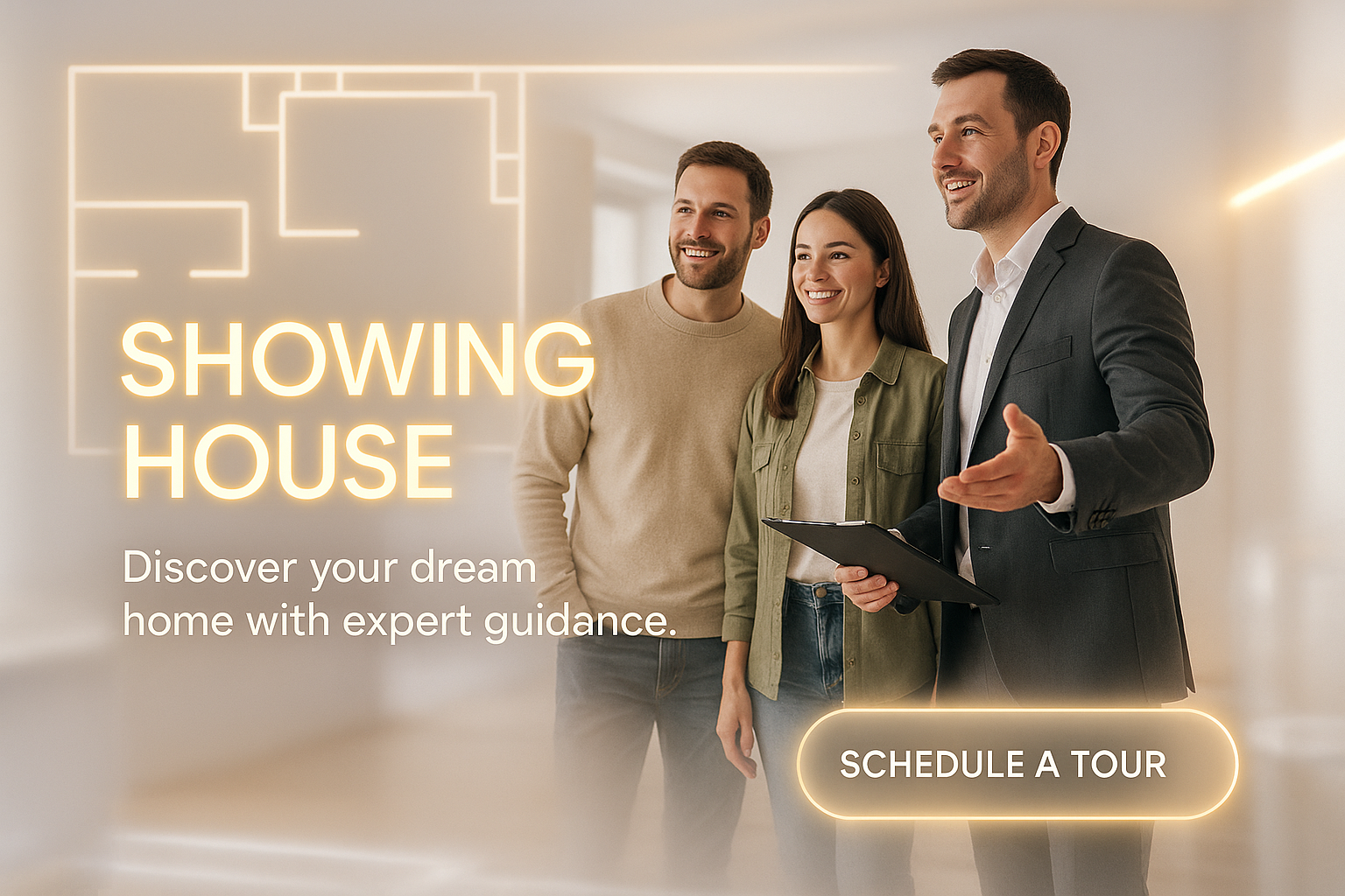 Engaging real estate promotional graphic designed to invite potential buyers to schedule a home tour, featuring modern design elements and warm colors.