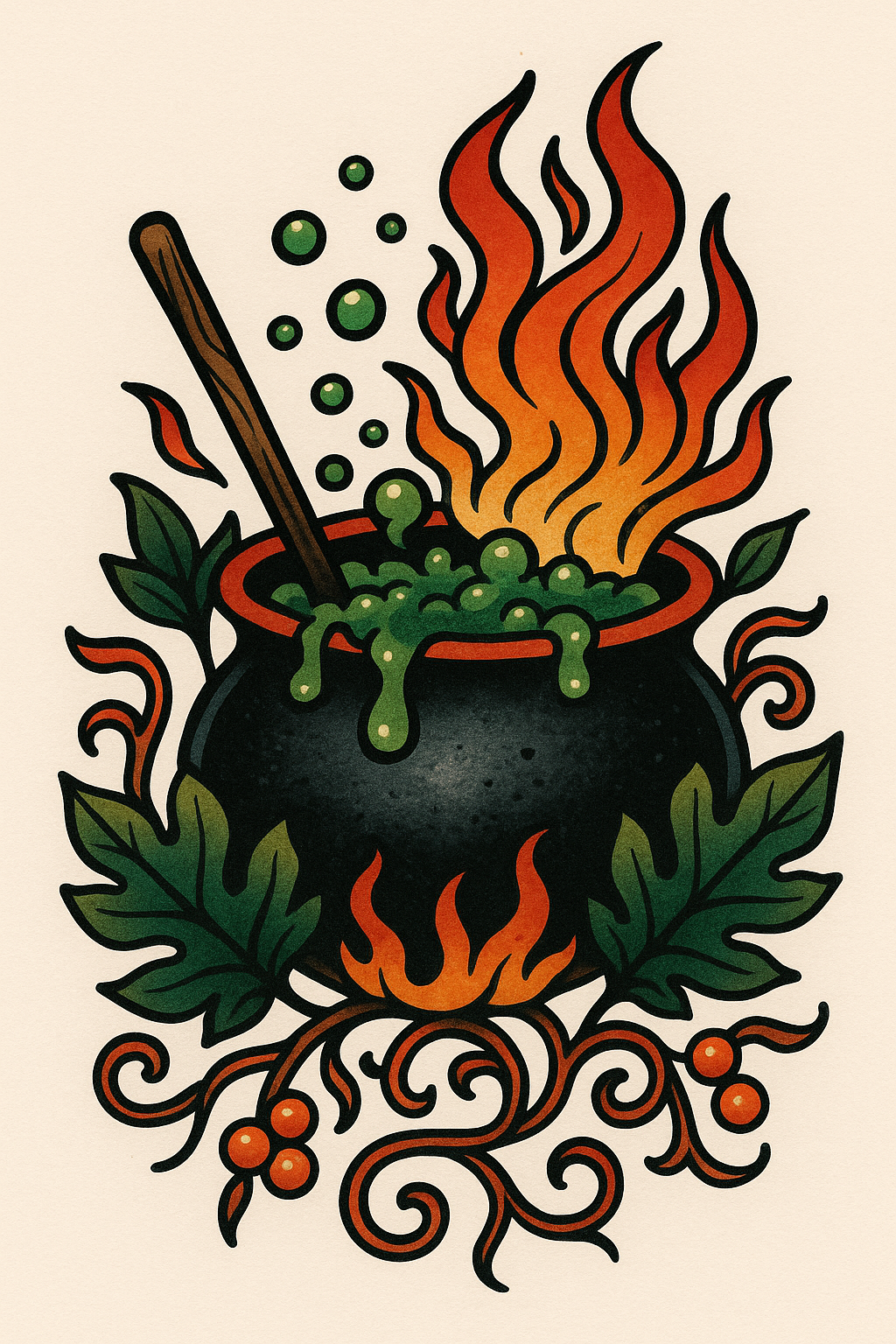 /Collection: /by davooda/Type: PNG/A vibrant illustration of a witch's cauldron, featuring flames and bubbling green liquid. The design is whimsical and suitable for Halloween-themed graphics, merchandise, or artistic prints.