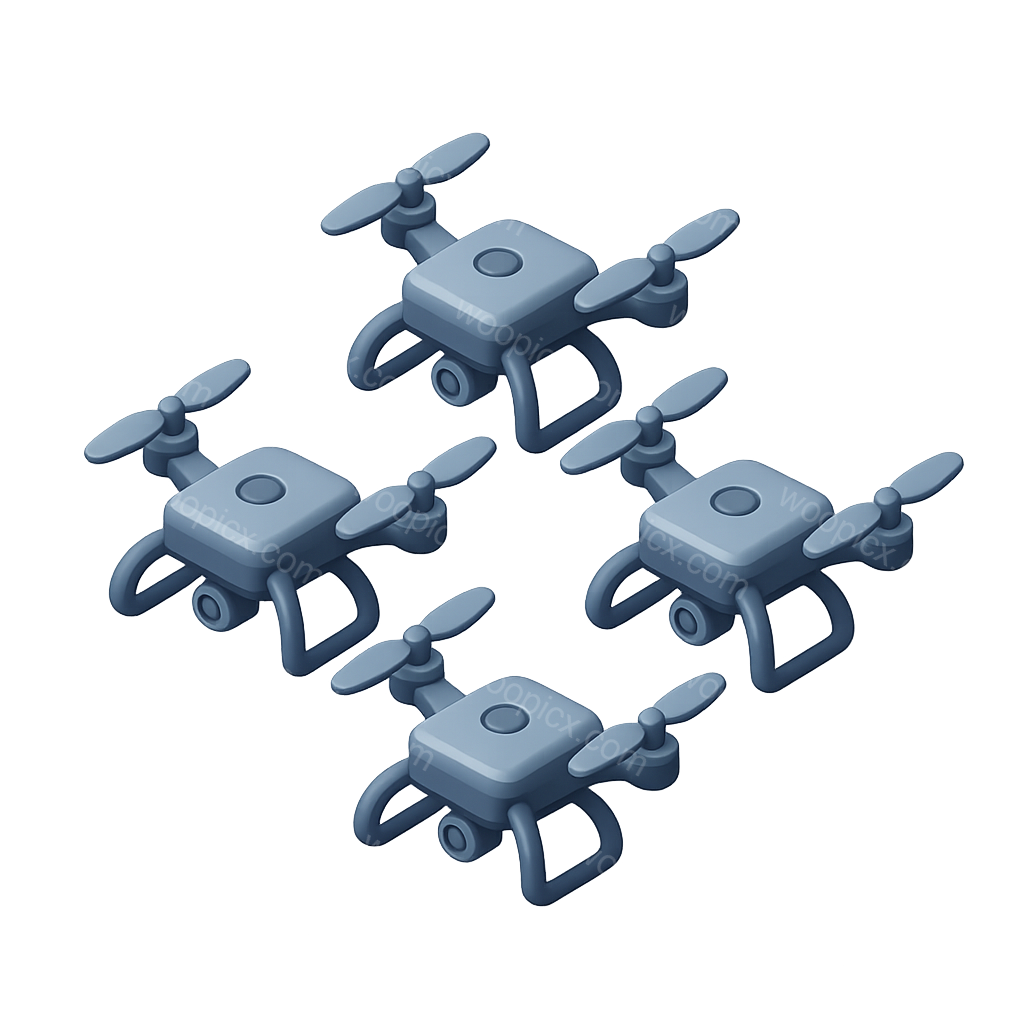 A 3D illustration of a drone swarm formation featuring four drones in a three-quarter view. The design has a sleek isometric style with a volumetric effect on a transparent background.