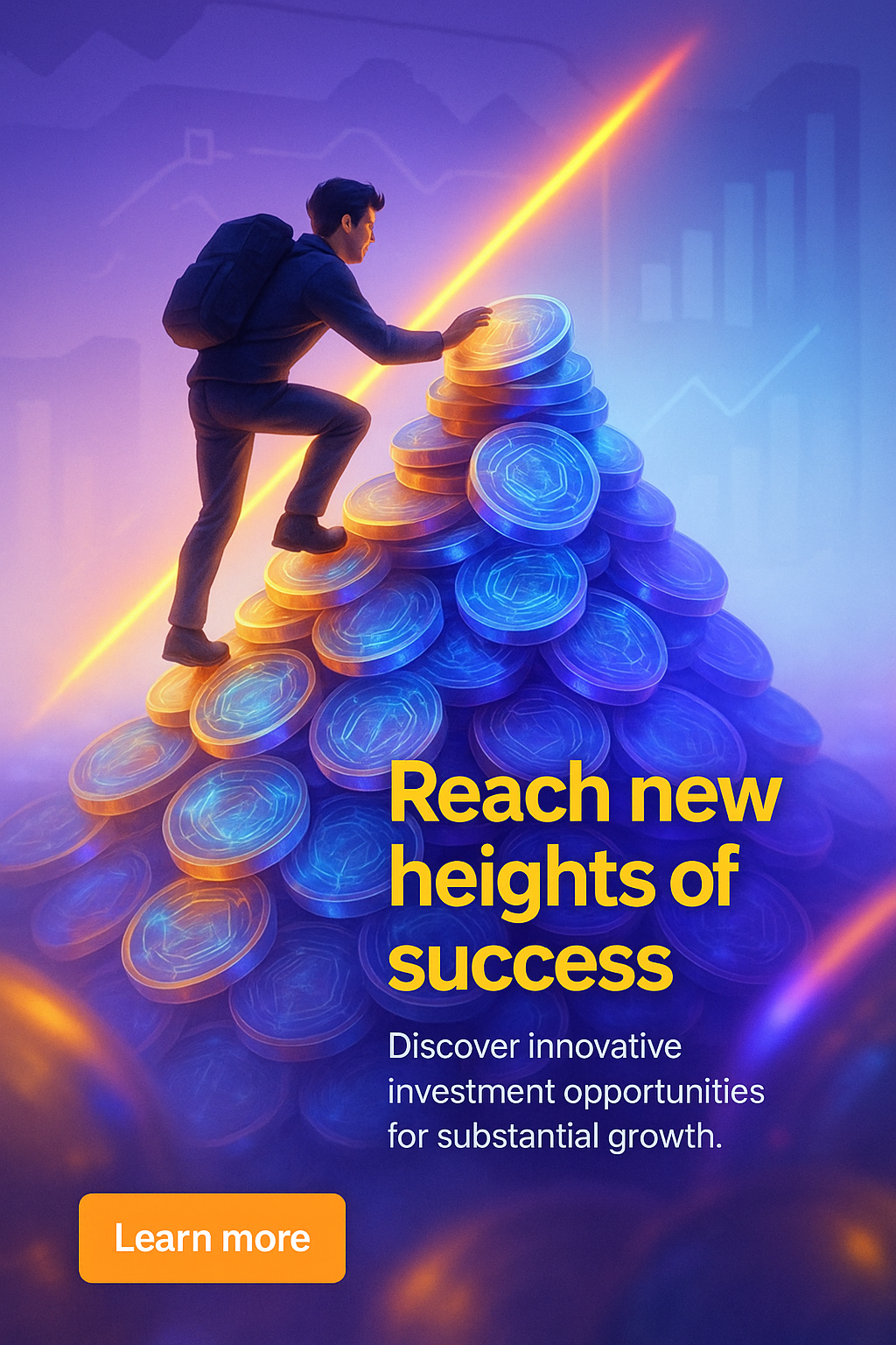 Vibrant digital illustration depicting a character climbing a pyramid of coins, symbolizing investment growth, ideal for financial services marketing.