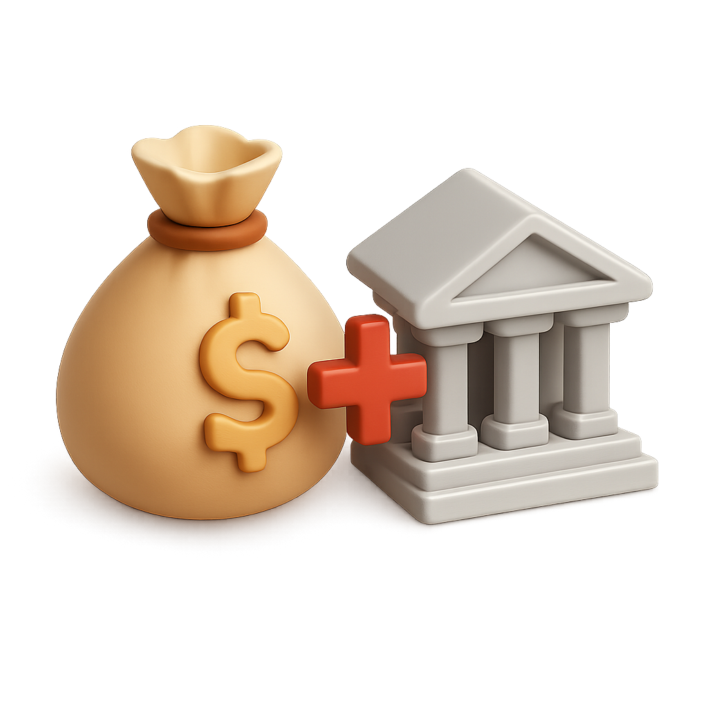 A visually appealing 3D icon featuring a money bag and a bank building. The design has a transparent background and showcases a three-quarter view with an isometric, volumetric feel.