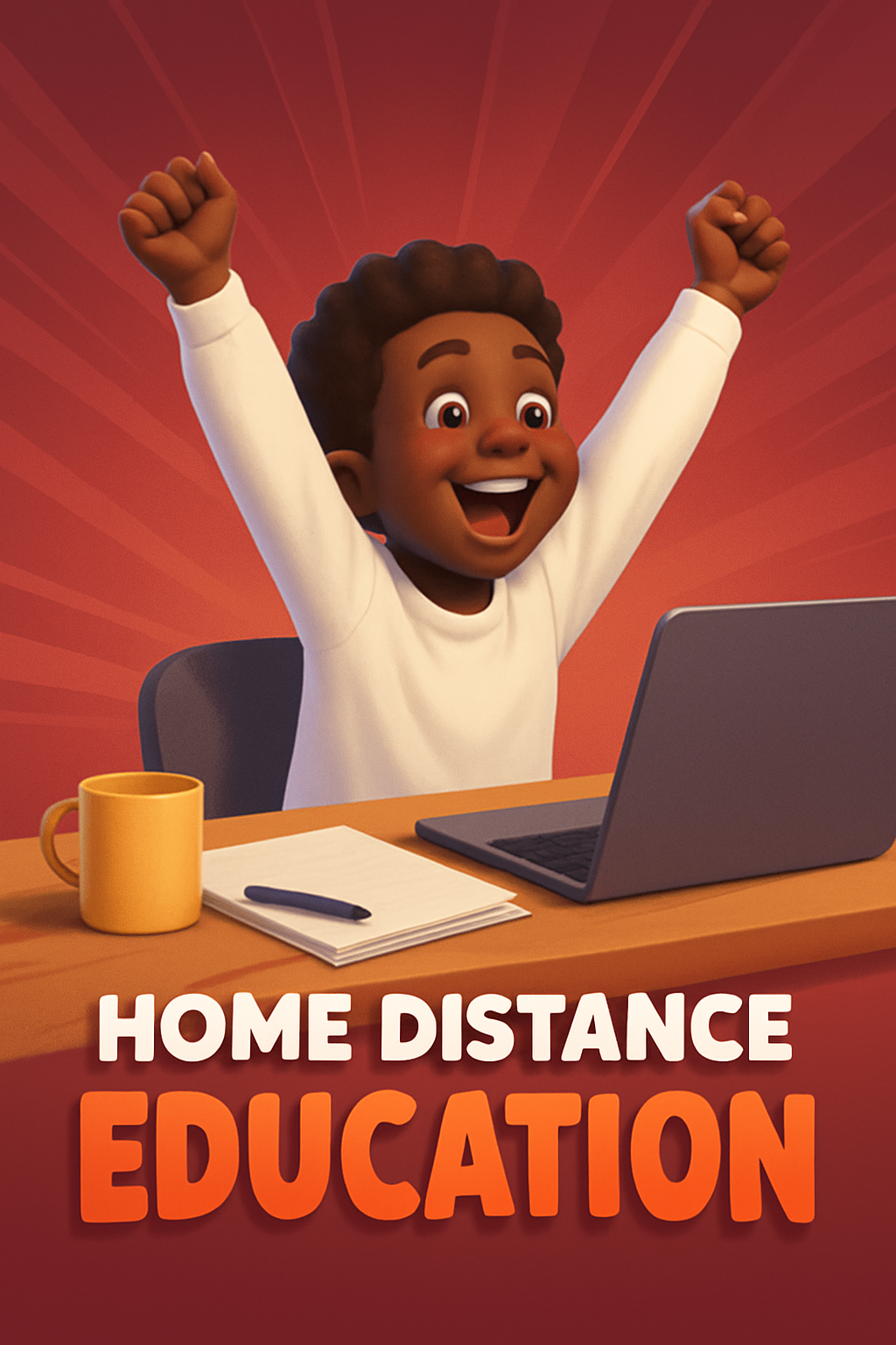 A young African American boy joyfully raises his hands during home distance education, sitting at a desk with a laptop and a cup. The dynamic background features rays of color, enhancing the excitement of learning.