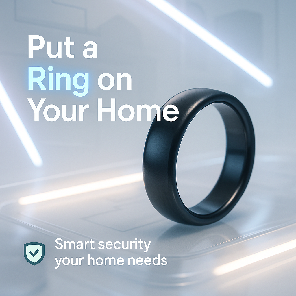 Promotional graphic featuring a sleek black ring designed for home security, set against a futuristic background. Ideal for technology marketing.