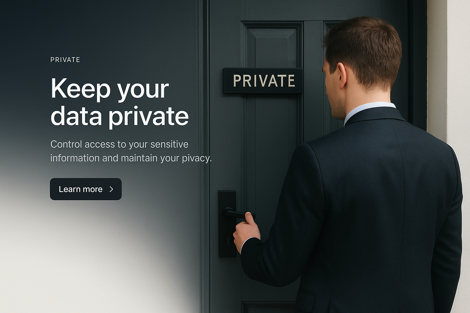 A professional individual approaches a door labeled 'PRIVATE', emphasizing data security. The design features a gradient background and clear text, promoting privacy.