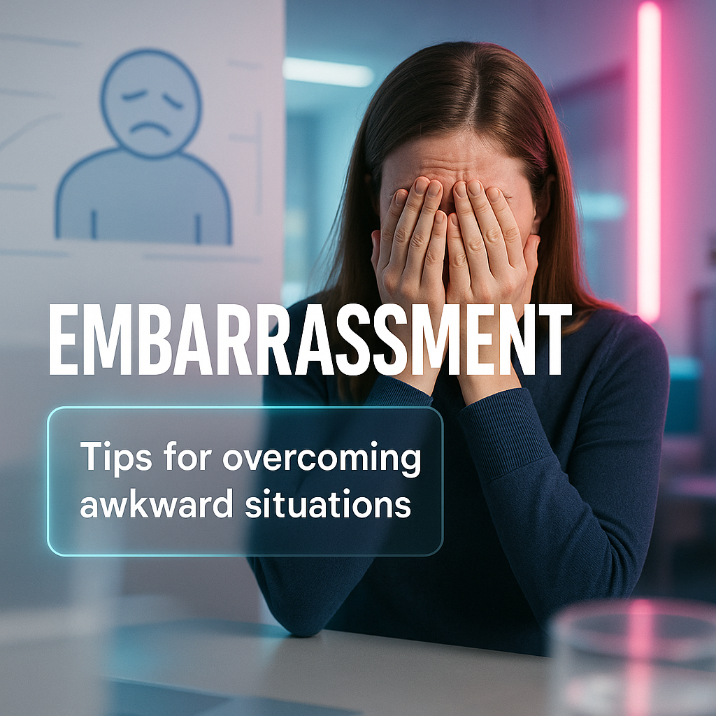 /Collection: /by davooda/Type: PNG/A social media post designed to provide tips for overcoming awkward situations, featuring a distressed individual with hands covering their face and a subdued color palette for emotional resonance.