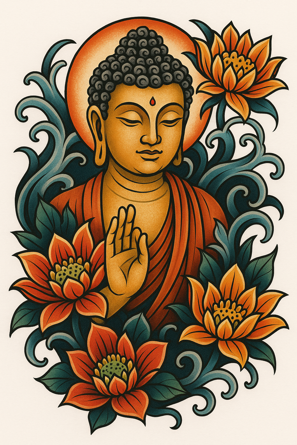 Illustrative Buddha Artwork Surrounded by Lotus Flowers