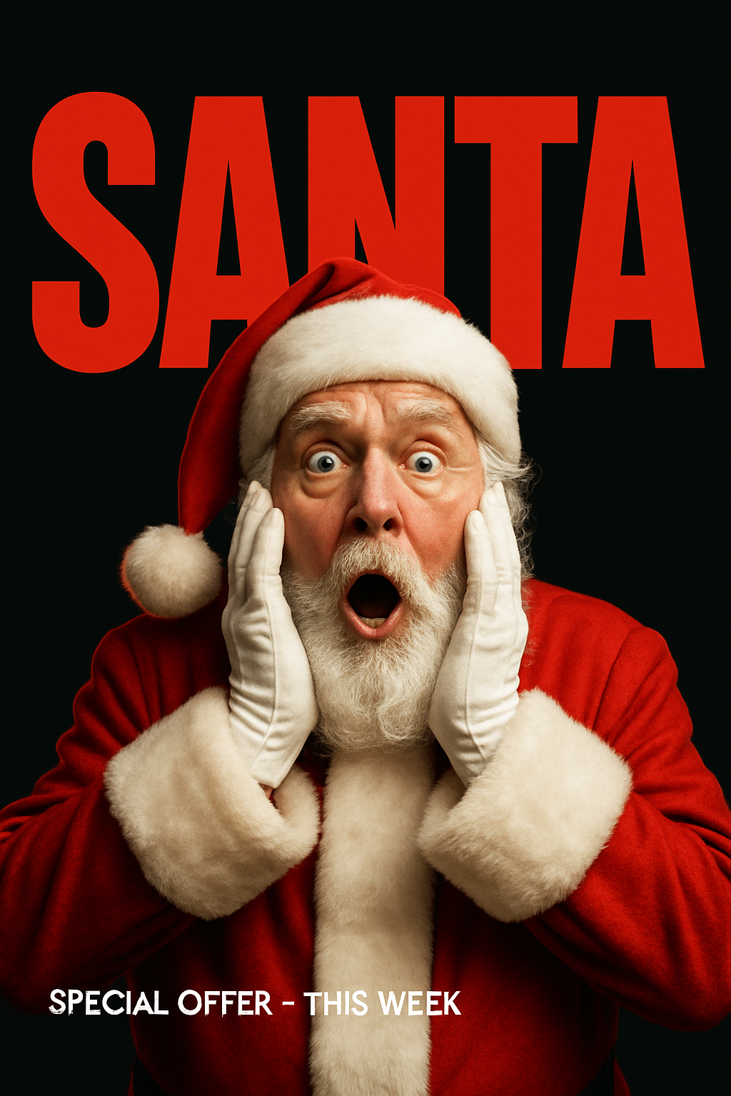 /Collection: /by davooda/Type: PNG/A realistic 3D depiction of a shocked Santa Claus in a bold red banner. The background features a subtle gradient, enhancing the dramatic composition. The word 'SANTA' dominates the upper half, balancing with fine text below.