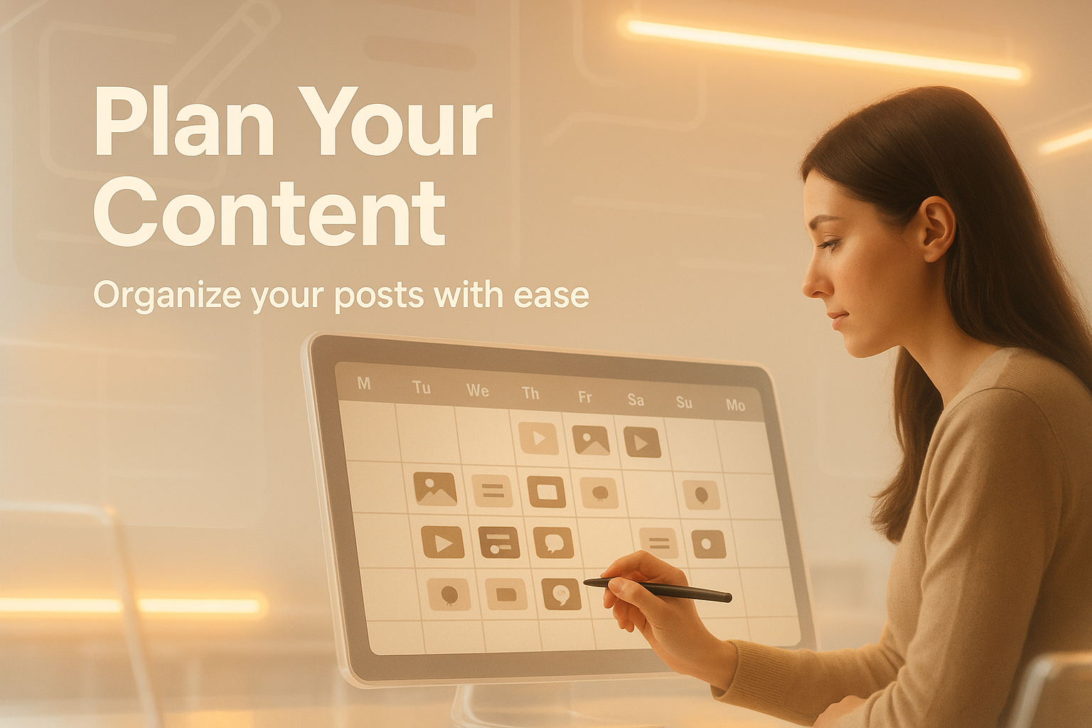 /Collection: /by davooda/Type: PNG/Professional graphic depicting a woman planning content on a digital interface, ideal for social media or marketing contexts. The soft color palette and modern design elements enhance its appeal.