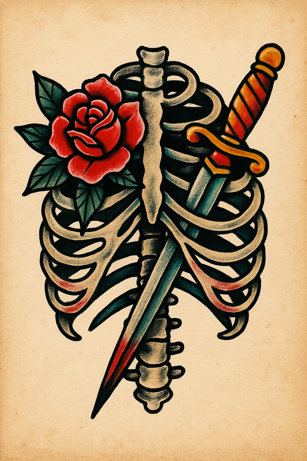 This image is a tattoo design showcasing a skeleton ribcage intertwined with a vibrant rose and a sword. The style is bold and colorful, appealing to tattoo enthusiasts.