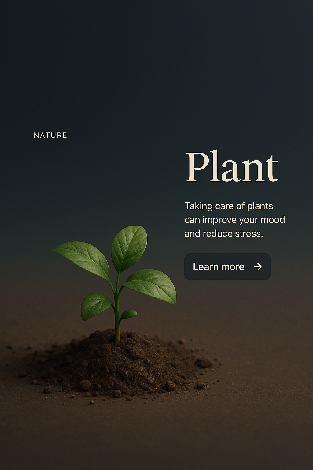 /Collection: /by davooda/Type: PNG/A beautifully designed 3D scene featuring a small green plant emerging from dark soil, accompanied by informative text and a call-to-action button. The background transitions smoothly from dark to a solid color.