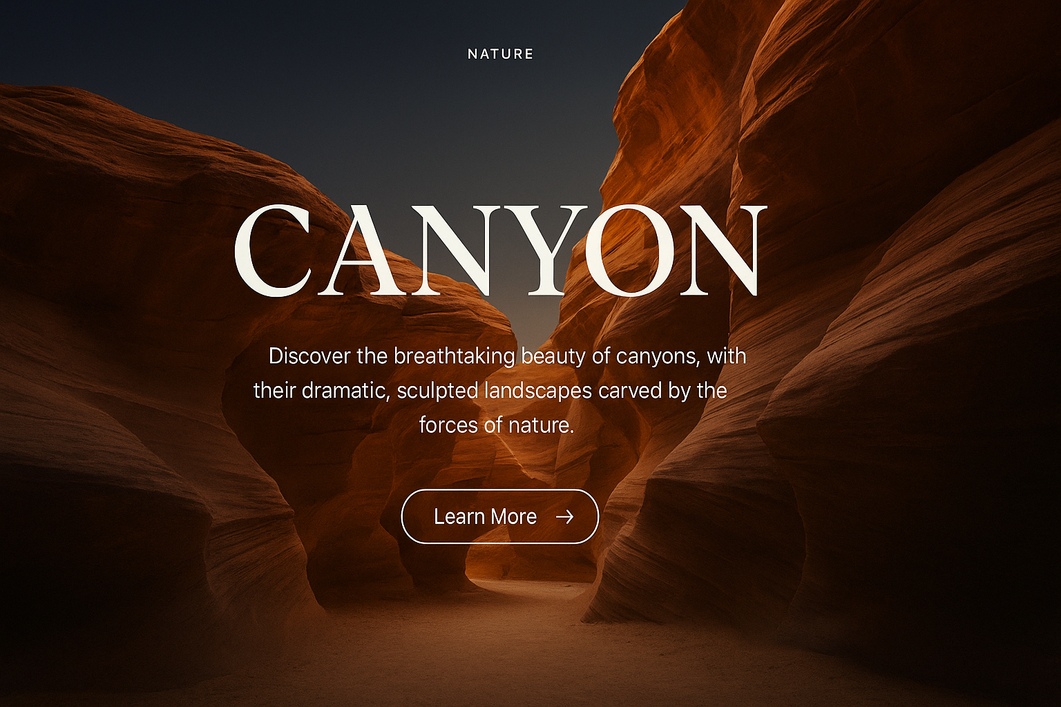 A breathtaking canyon scene showcasing dramatic rock formations and warm hues, accompanied by an inviting 'Learn More' button that enhances user interaction.