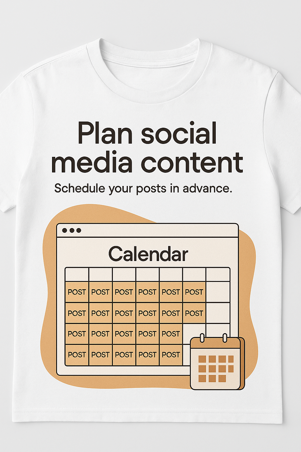 Graphic t-shirt design featuring a calendar illustration aimed at social media managers, emphasizing content scheduling with a playful and modern aesthetic.