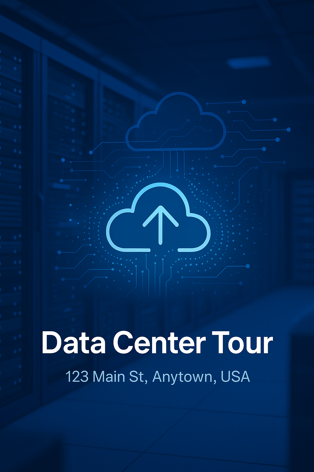 Modern promotional graphic featuring a cloud icon and data center background, designed for a data center tour event. Ideal for marketing and informational purposes.