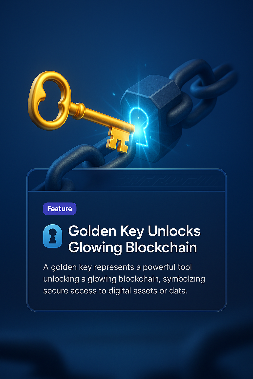 /Collection: /by davooda/Type: PNG/A striking 3D illustration featuring a golden key unlocking a glowing blockchain, symbolizing secure access to digital assets. The design includes a gradient background and informative text block.
