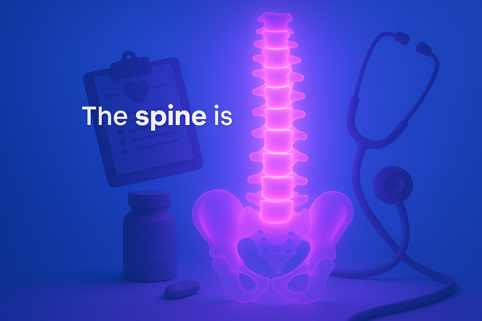 This image showcases a glowing spine in neon pink against a solid blue background. The spine is surrounded by medical elements like a stethoscope and a prescription pad, creating a thematic connection.
