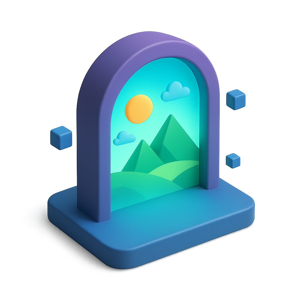 A vibrant 3D portal icon featuring a scenic view of mountains and a sun against a transparent background. The design includes isometric elements and a volumetric effect.