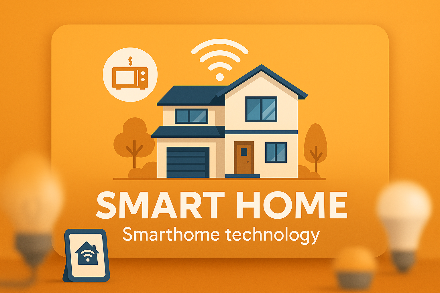 /Collection: /by davooda/Type: PNG/A vibrant illustration depicting a modern smart home with technology icons, ideal for marketing smart home products and services. The design features a warm color palette and clean lines.