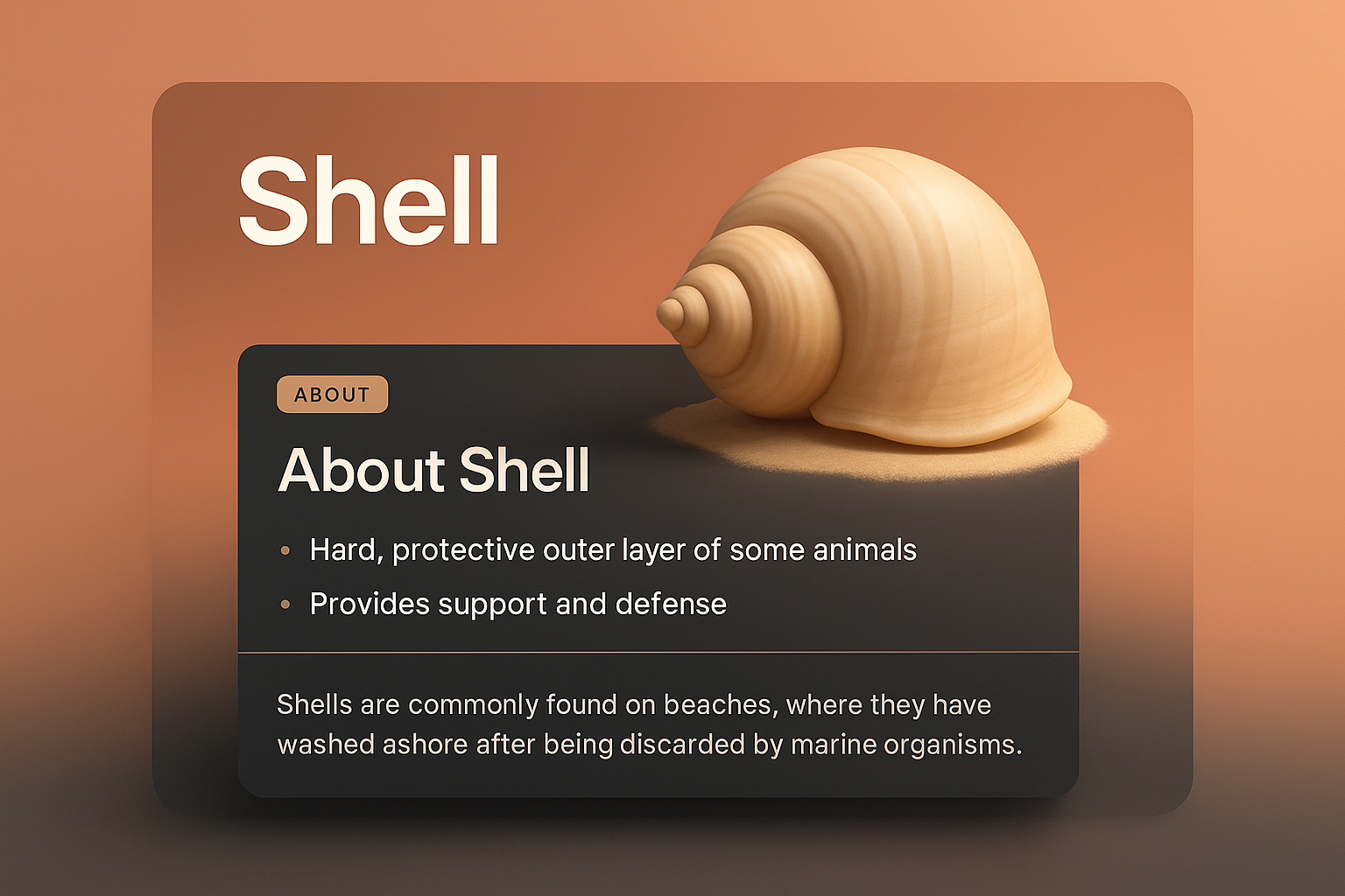 /Collection: /by davooda/Type: PNG/This image showcases a realistic 3D illustration of a shell, integrated into a web design layout. It features a dark panel with descriptive text about shells, enhancing the visual appeal.