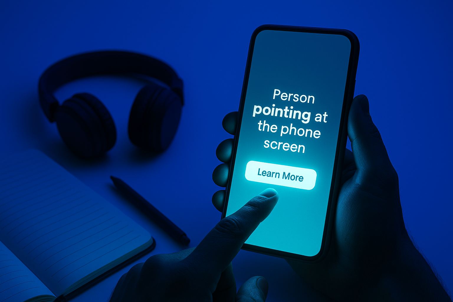 A person points at a glowing phone screen in a shadowy environment illuminated by cool blue and violet hues. Surrounding objects include headphones and a notebook.