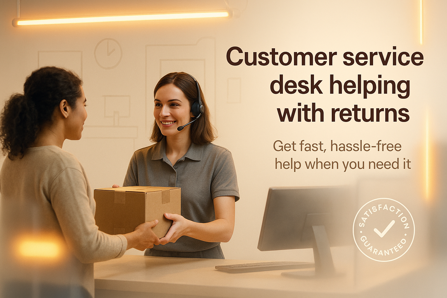 /Collection: /by davooda/Type: PNG/Engaging image showcasing a customer service representative assisting a customer with returns. The modern, inviting design emphasizes convenience and support, suitable for retail or e-commerce environments.