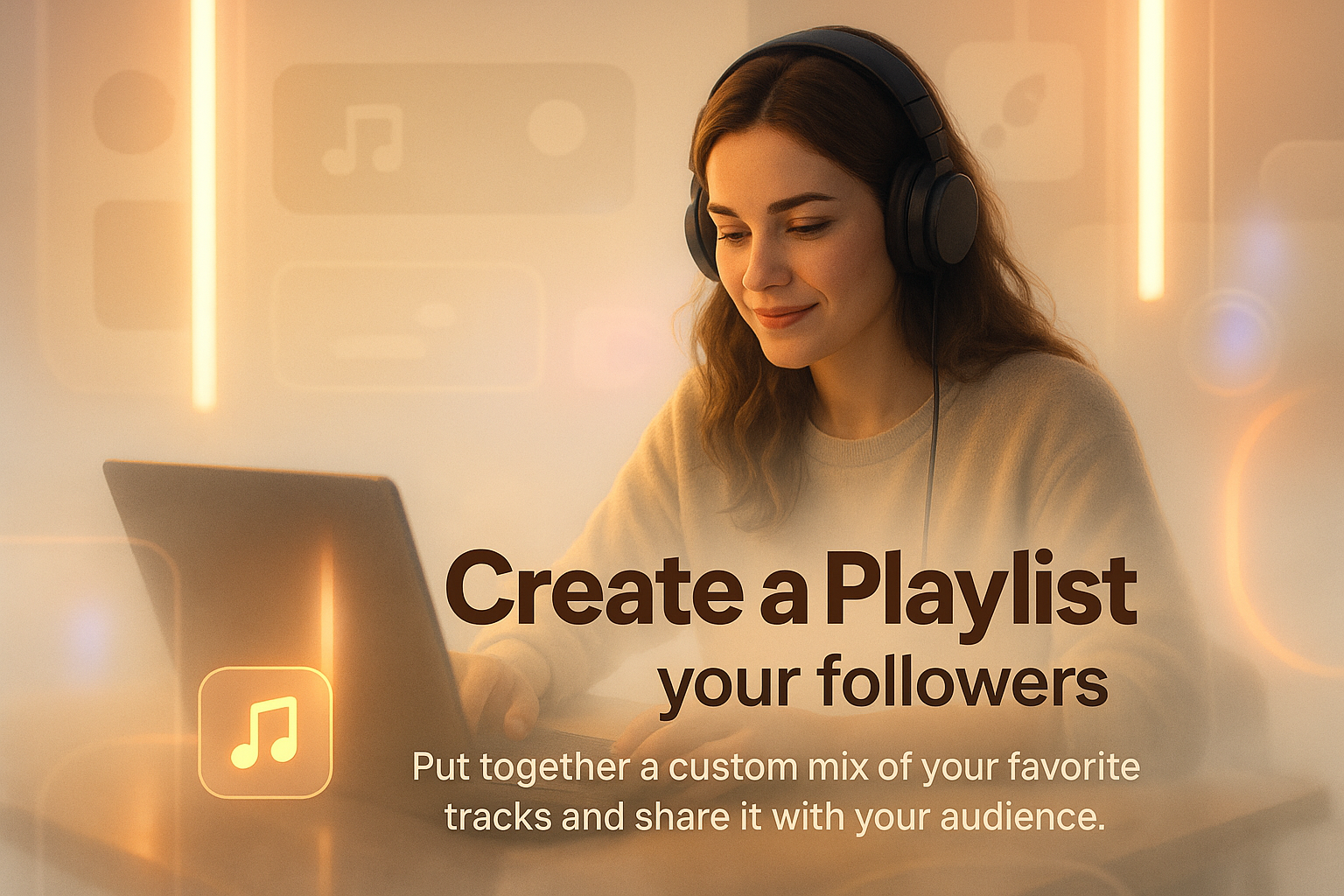/Collection: /by davooda/Type: PNG/A visually appealing social media post encouraging users to create and share playlists. The design features a young woman with headphones, emphasizing a personal touch for music sharing.