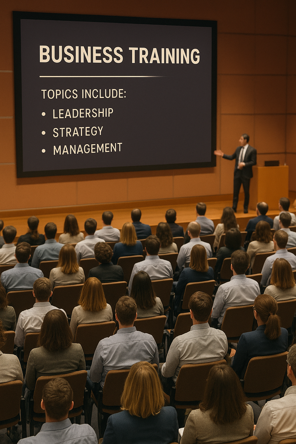 /Collection: /by davooda/Type: PNG/Professional business training session featuring an engaging speaker presenting topics on leadership, strategy, and management to a focused audience. Ideal for corporate training materials.