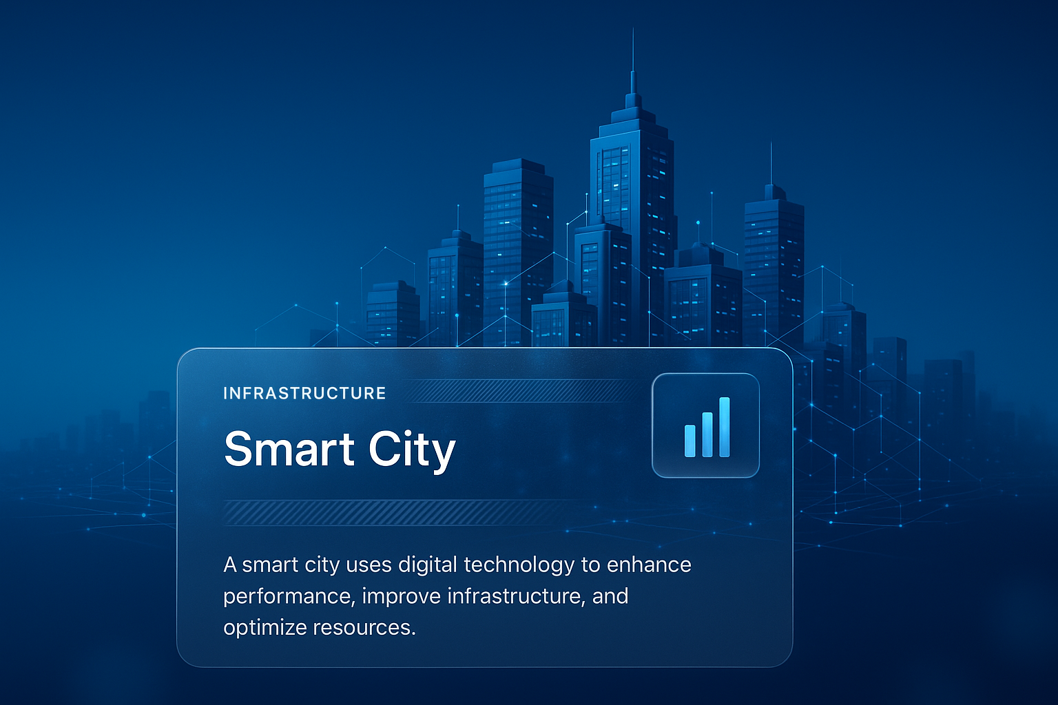 /Collection: /by davooda/Type: PNG/A digital illustration of a futuristic smart city skyline with a focus on technology. The design features a prominent information block overlaying the cityscape.