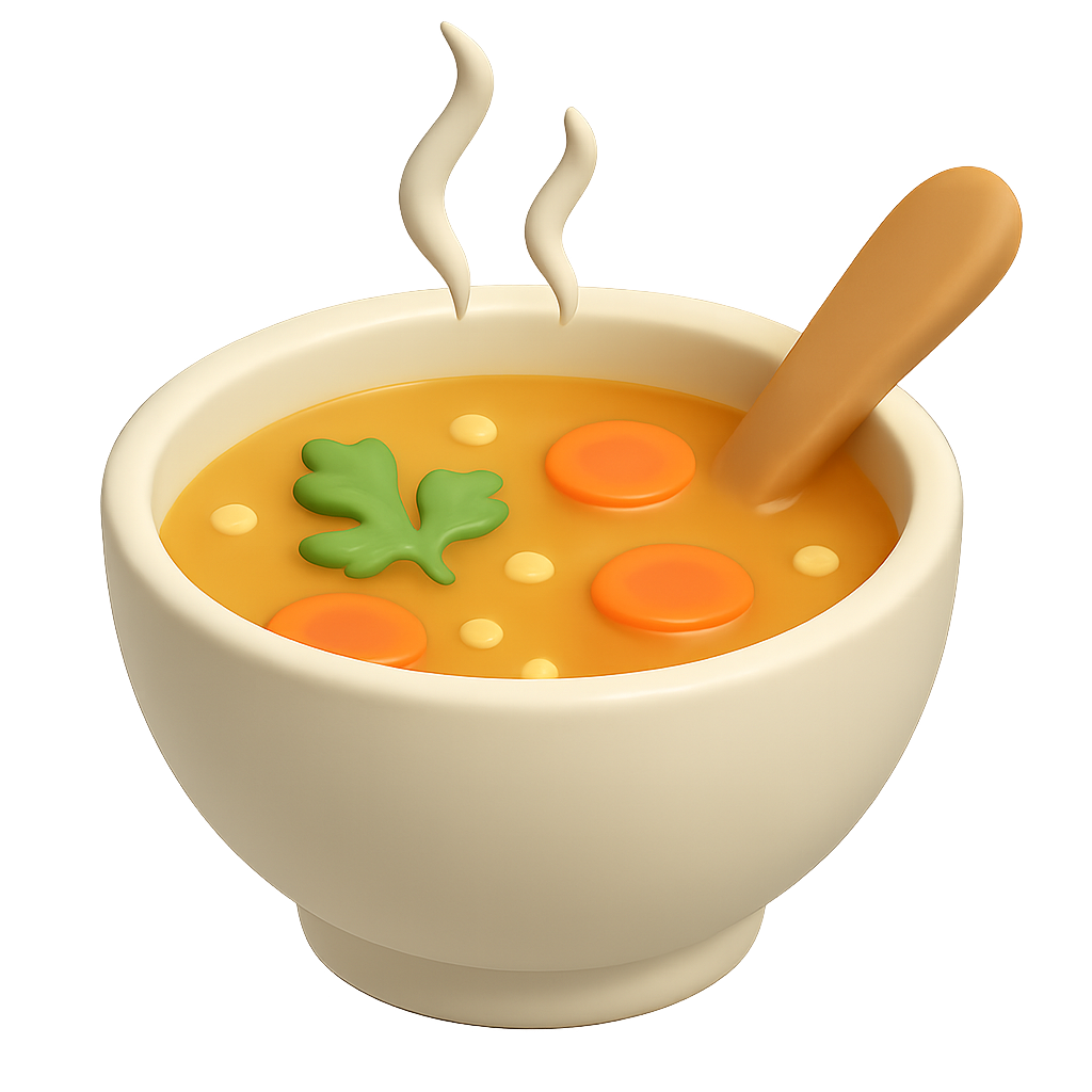 A 3D icon of a bowl of broth soup featuring carrots and herbs, with steam rising, presented in a three-quarter view. The design is colorful and playful.