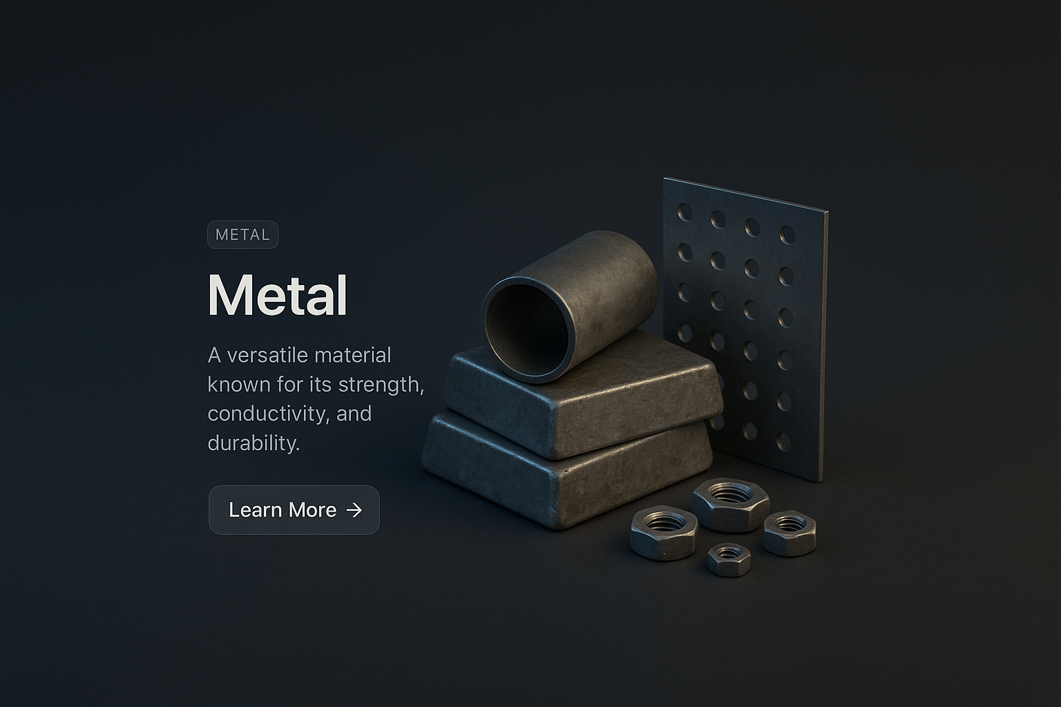 /Collection: /by davooda/Type: PNG/A detailed 3D rendering of various metal objects including a cylinder, plates, and nuts on a dark gradient background. The composition is zoomed out to showcase the scene in a small scale, featuring text elements and a call-to-action button.