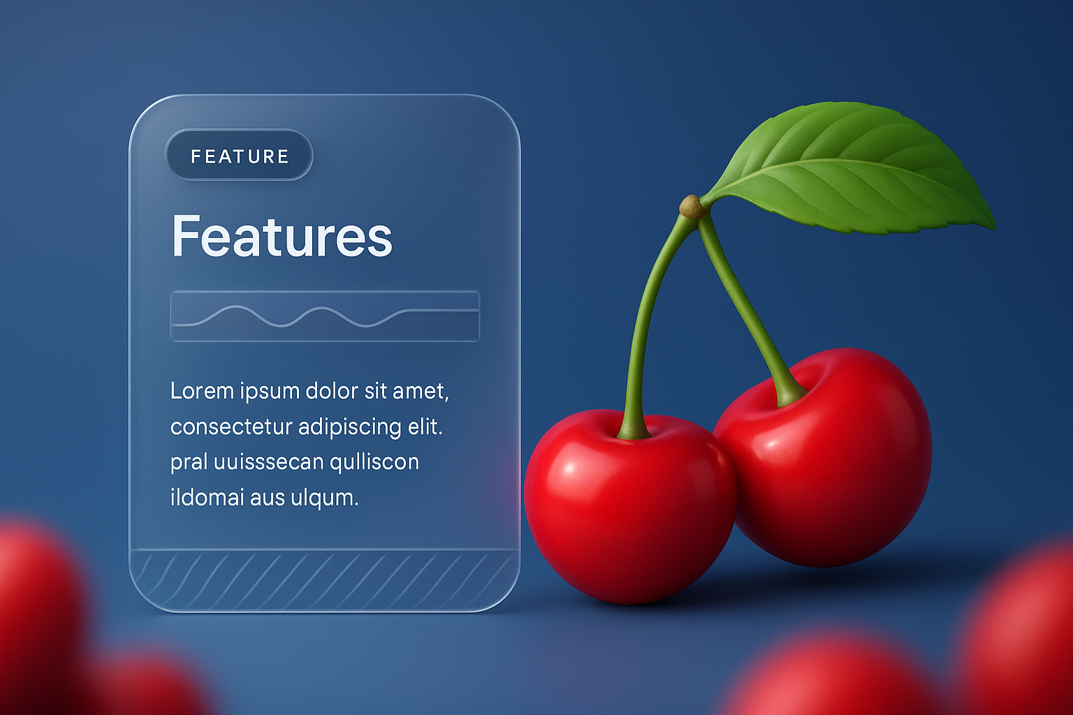 /Collection: /by davooda/Type: PNG/A visually striking composition featuring bright red cherries with a green leaf on a smooth gradient background. The design includes a translucent glass effect with text, enhancing its appeal for summer-themed visuals.