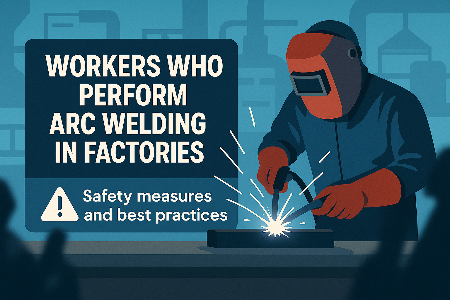 /Collection: /by davooda/Type: PNG/Informative graphic illustrating safety measures for arc welding in factories, featuring a worker in protective gear and visual emphasis on safety practices, suitable for training materials.