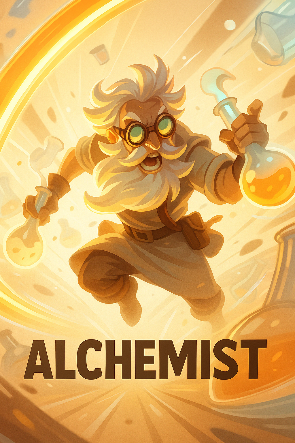 /Collection: /by davooda/Type: PNG/An energetic depiction of an alchemist in action, surrounded by glowing neon effects. The vibrant scene features translucent elements and a soft halo, with beige and brown tones enhancing the dynamic composition.