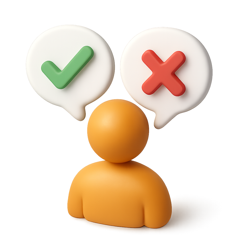 /Collection: /by davooda/Type: PNG/This image features two 3D speech bubbles, one with a green check mark and the other with a red cross mark, alongside a stylized figure. The bubbles are designed in a three-quarter isometric view with a smooth, volumetric appearance.