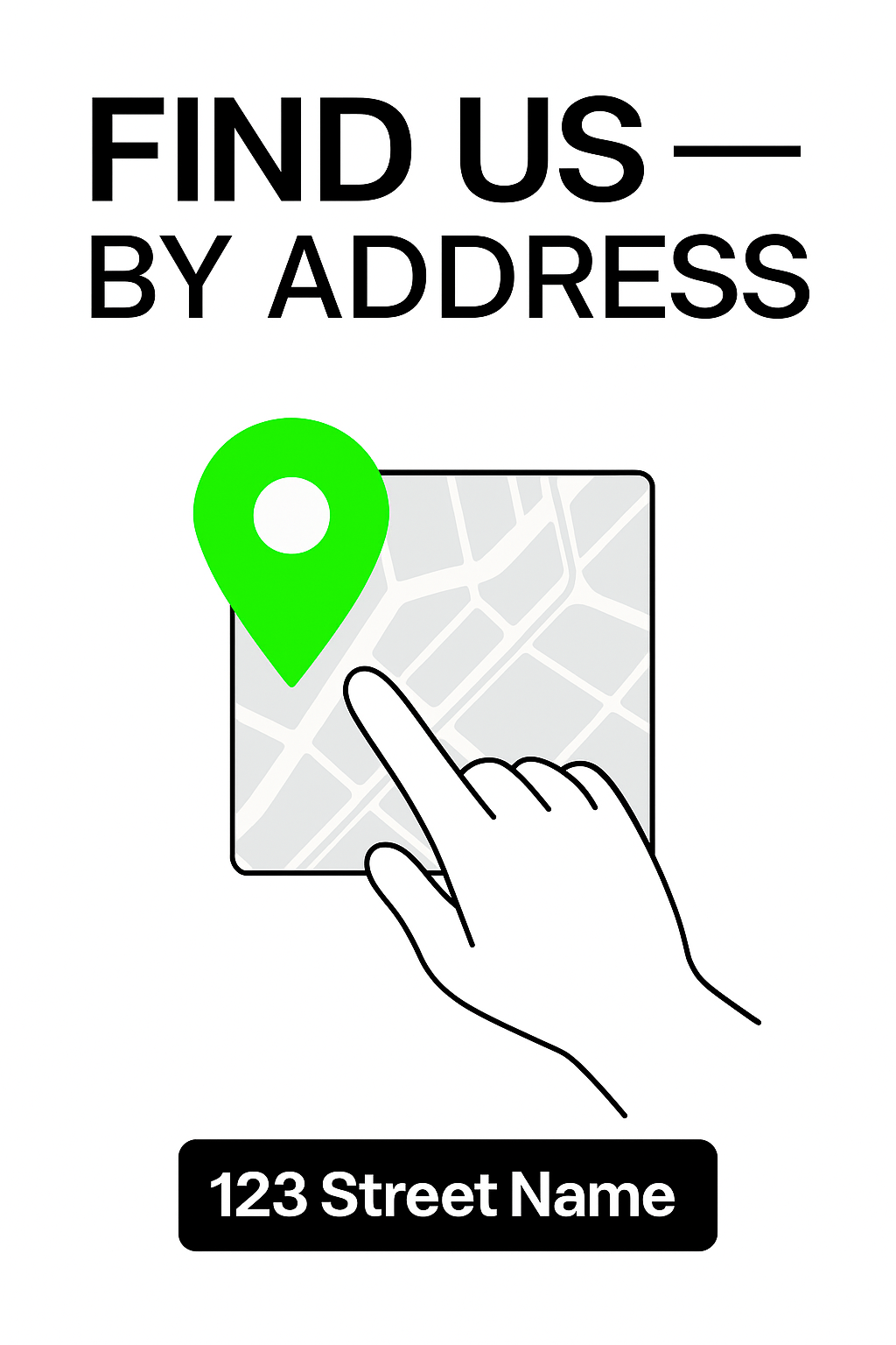 Simple graphic designed for location guidance featuring a hand pointing to a map with a location pin. Ideal for wayfinding or business signage.