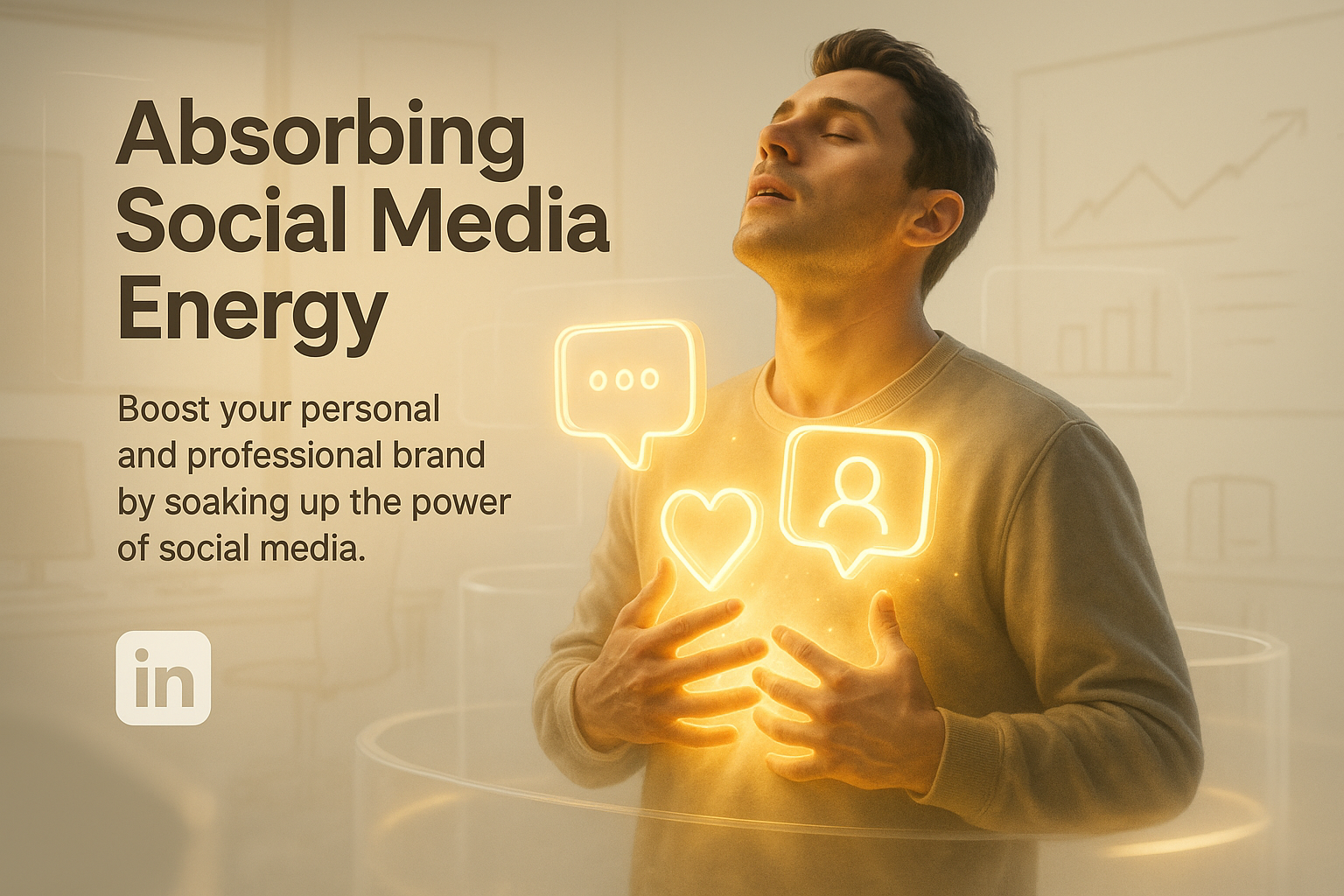 Engaging graphic depicting a man absorbing social media energy, designed to promote personal and professional branding. Ideal for digital marketing and social media content.