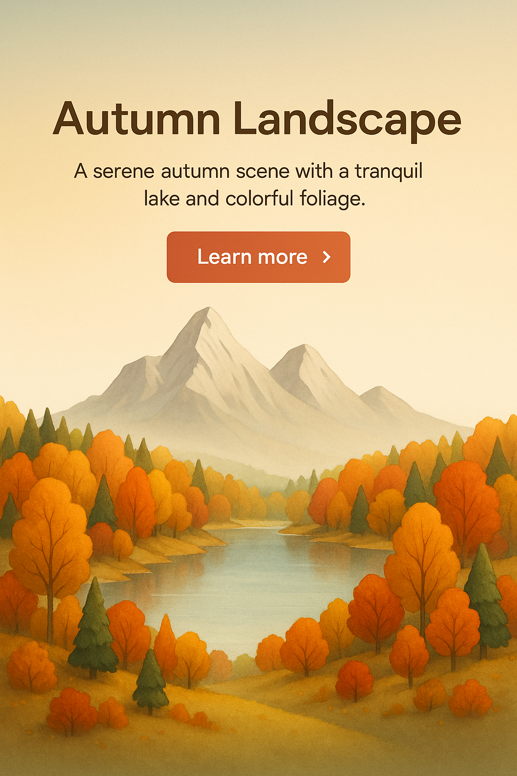 A tranquil autumn landscape featuring majestic mountains, vibrant fall foliage, and a serene lake. The scene is designed with a watercolor aesthetic, emphasizing realism.