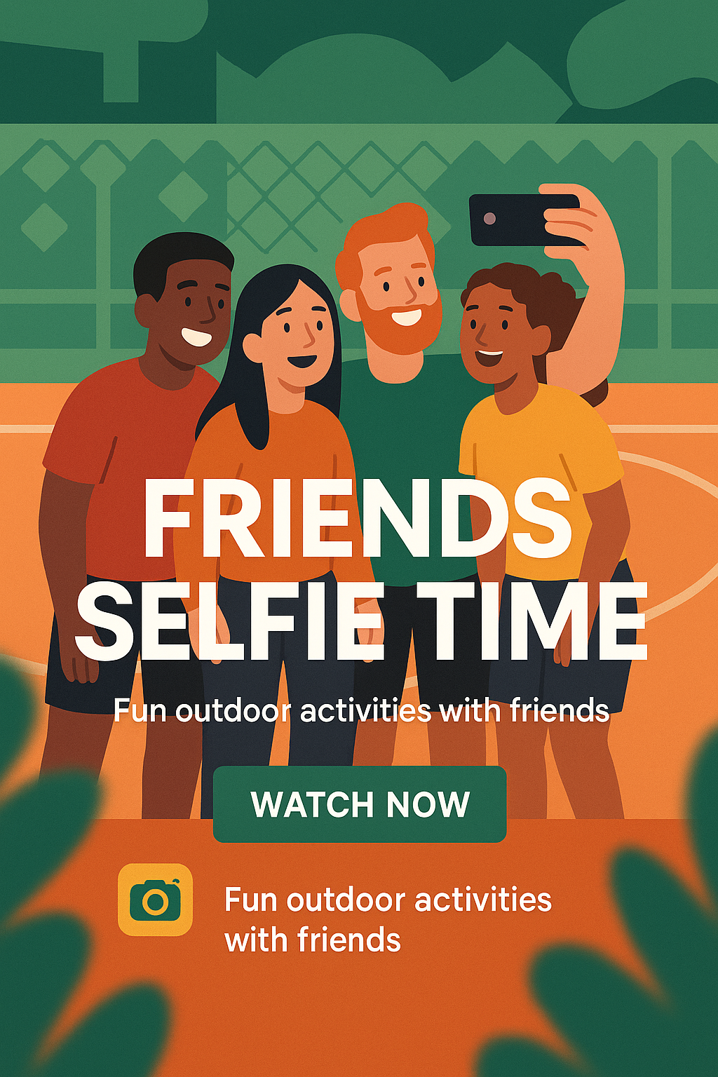 Vibrant social media graphic showcasing a group of friends taking a selfie during outdoor activities. Ideal for promoting fun and social engagement.