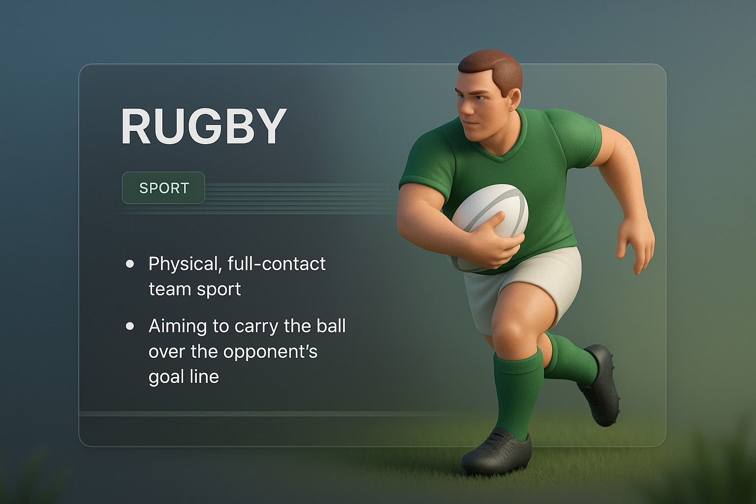 /Collection: /by davooda/Type: PNG/A 3D illustration of a rugby player in action, featuring a modern design with layered elements. The player is shown in a green jersey, running with a rugby ball, and accompanied by text blocks that describe the sport.