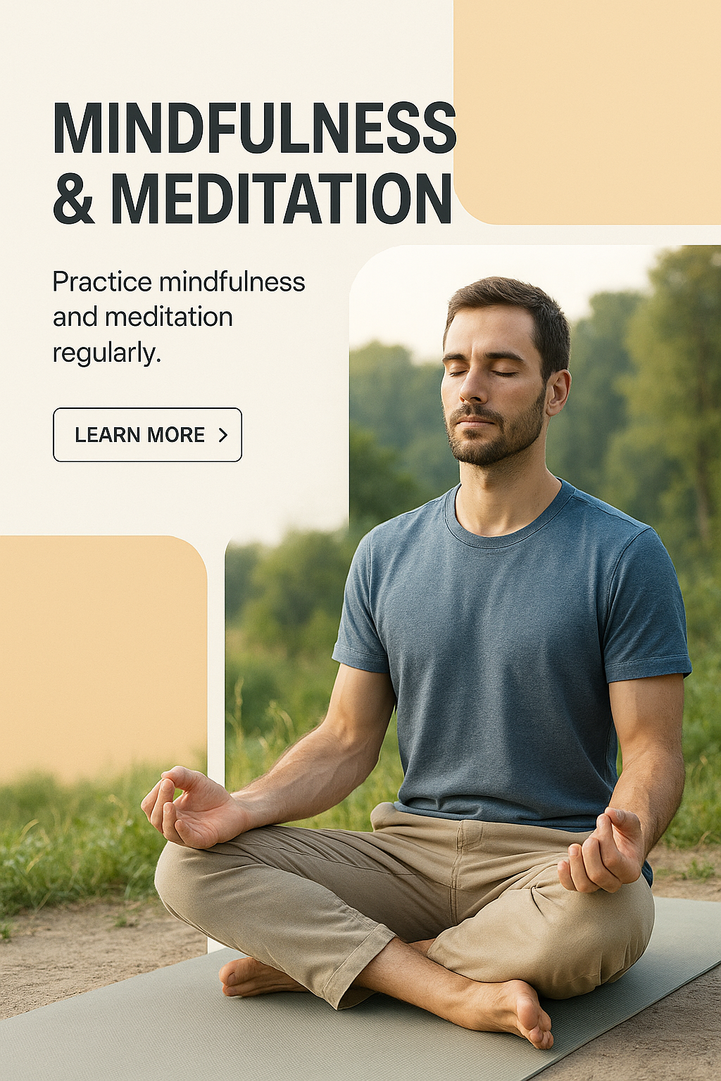 /Collection: /by davooda/Type: PNG/A man practicing mindfulness and meditation in a serene outdoor setting. The image features geometric block backgrounds, bold typography, and a clear call-to-action button.