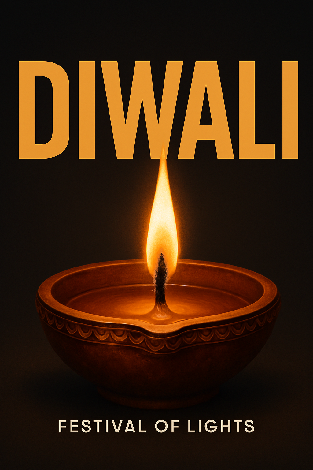 /Collection: /by davooda/Type: PNG/A captivating illustration of a Diwali diya oil lamp against a dark background, featuring a glowing flame. The layout includes a massive bold headline and subtle text elements, creating a modern and cinematic feel.