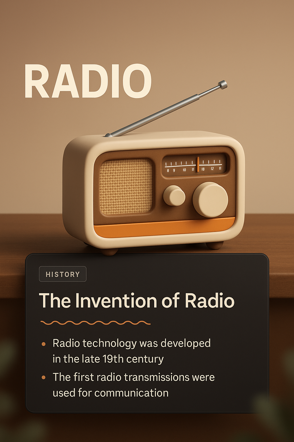 A 3D illustration of a vintage radio, showcasing its historical significance. The design features a gradient background and a dark info block with text regarding the invention of radio.