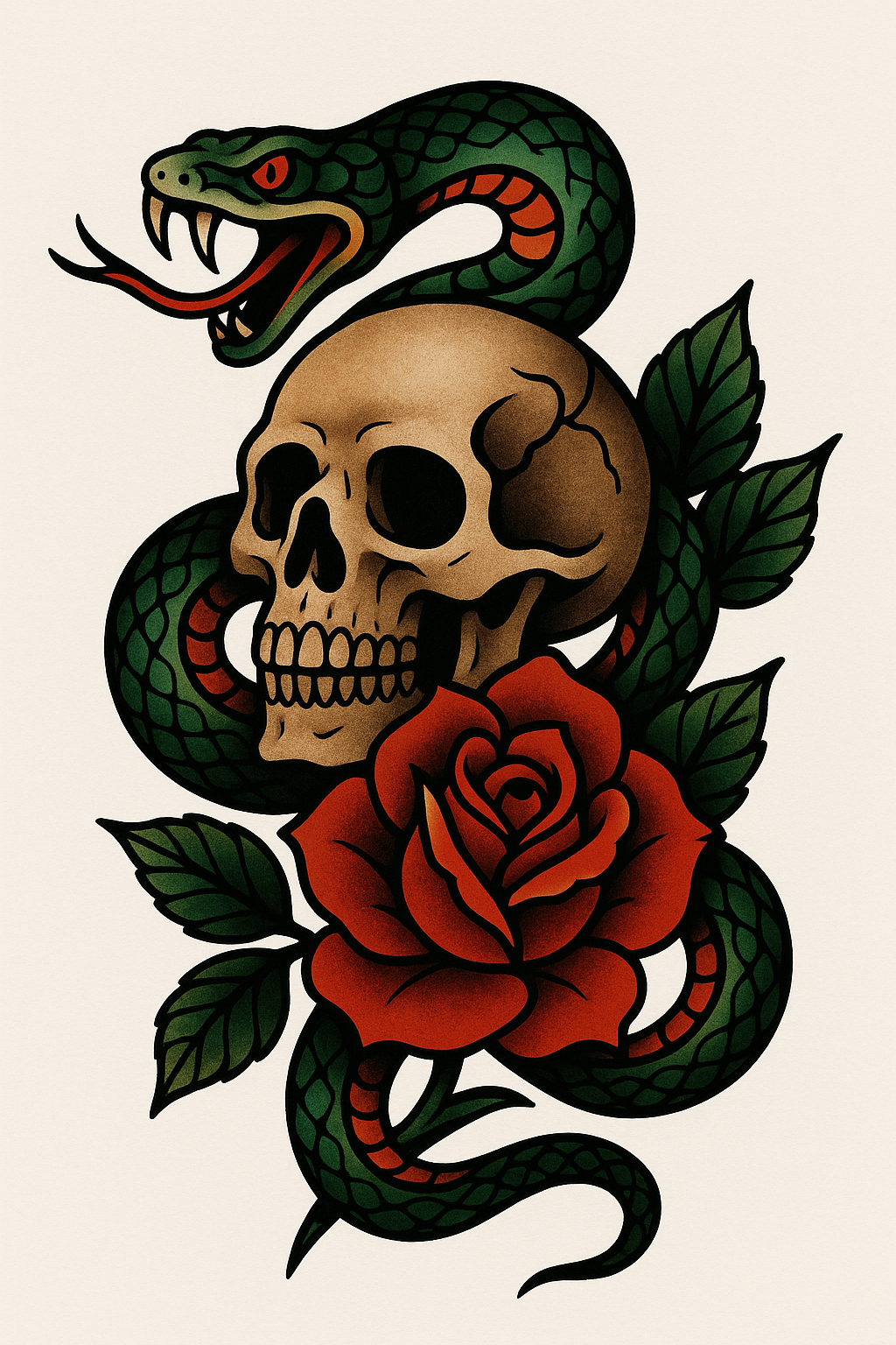 A striking tattoo design featuring a skull entwined with a green snake and a red rose, showcasing bold colors and classic tattoo artistry. Ideal for tattoo enthusiasts and artists.
