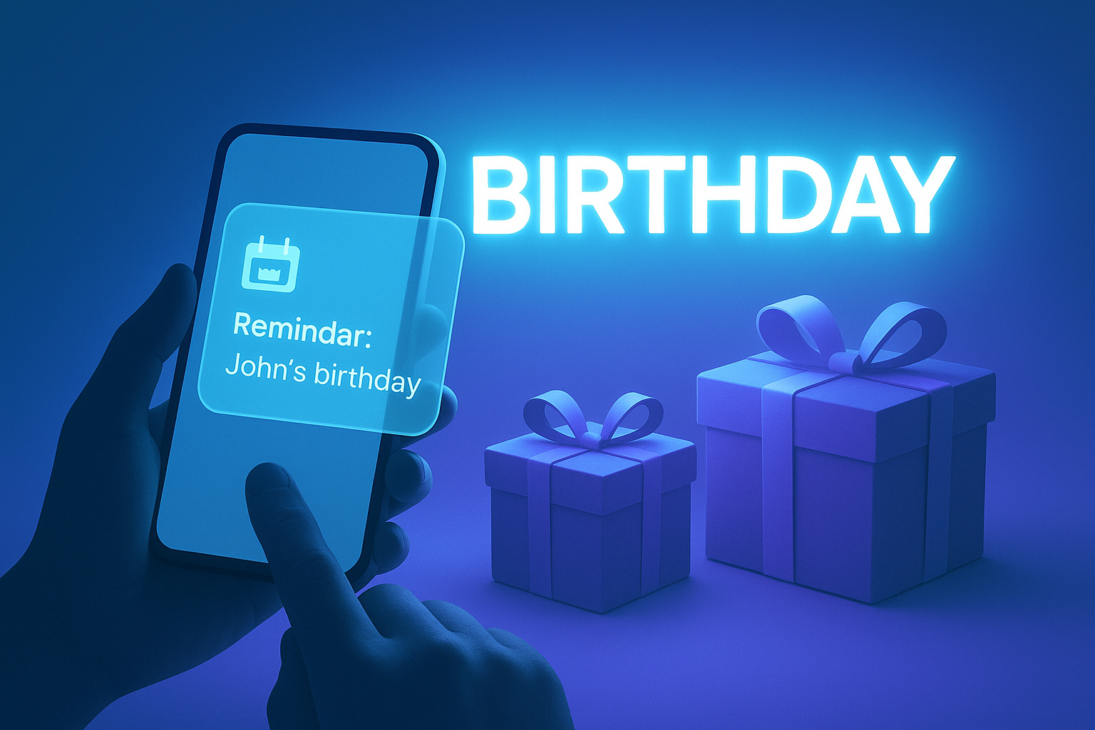 A hand holds a smartphone displaying a birthday reminder, with virtual gifts beside it. The scene is illuminated by a glowing 'BIRTHDAY' text, creating a joyful atmosphere.