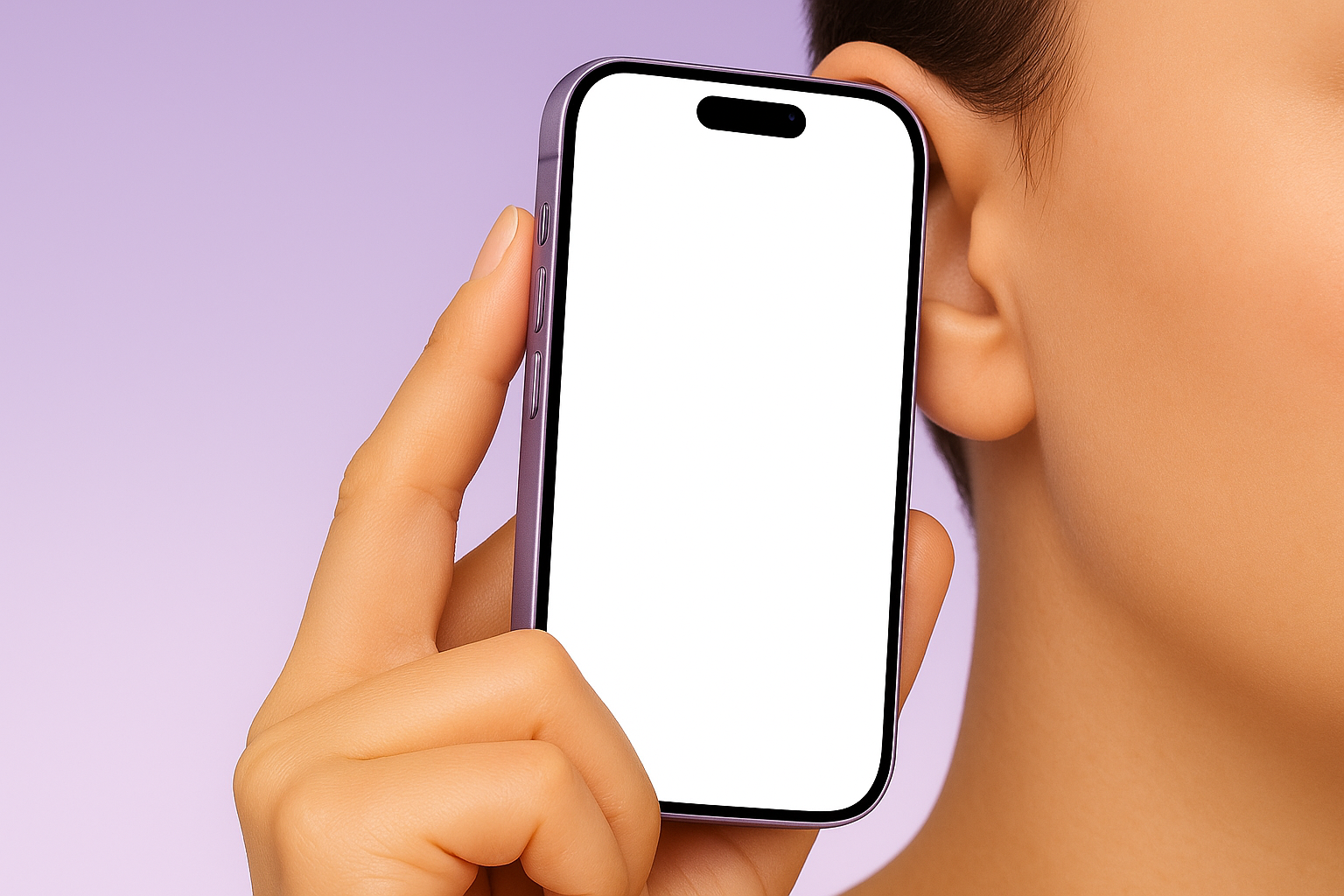 A close-up of a hand holding a purple smartphone to the ear, with a blank white screen. The background features a gradient purple hue, creating a modern and stylish look.