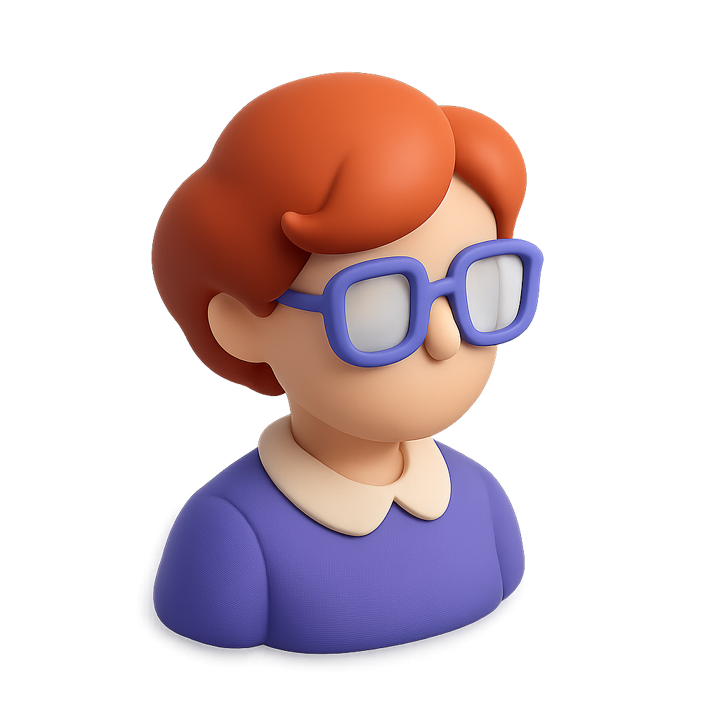 This image features a stylized 3D icon of a character with orange hair and blue glasses, set against a gradient background. The character is depicted in a three-quarter view, emphasizing its volumetric design.