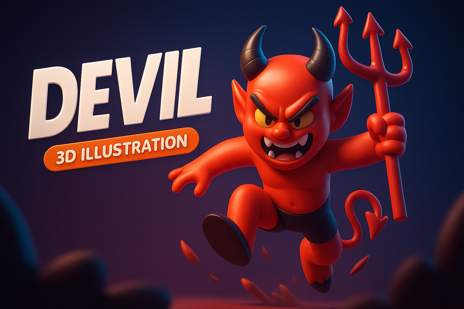 A vibrant 3D depiction of a devil character, featuring dynamic action and bold colors. The character is shown mid-motion, emphasizing energy and liveliness.