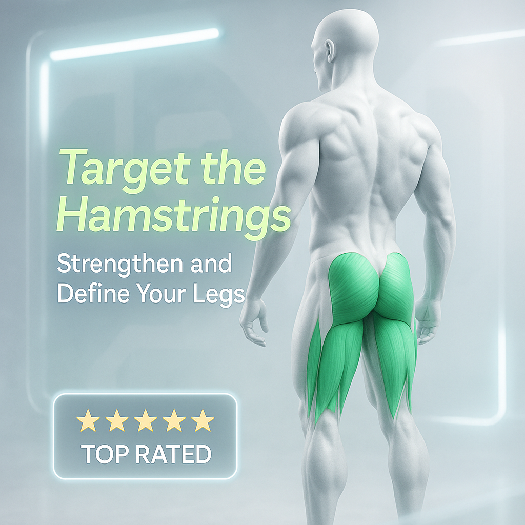 Dynamic fitness promotional image showcasing the hamstring muscles with a modern, sleek design. Ideal for health and fitness marketing, targeting an audience interested in leg workouts.