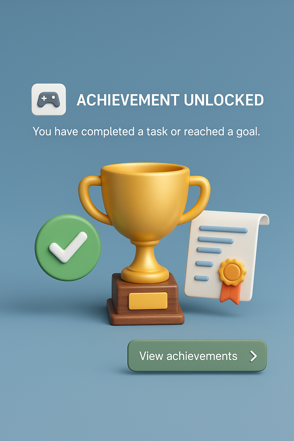 A detailed 3D illustration depicting an achievement unlocked concept. Features a trophy, a checklist, and a text block with a button in a zoomed-out view.