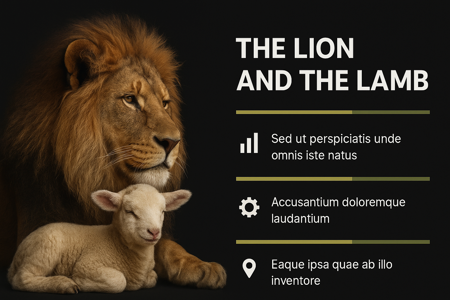 A striking image featuring a lion and a lamb, symbolizing peace and strength. The modern design includes text elements that enhance the theme, suitable for inspirational content.